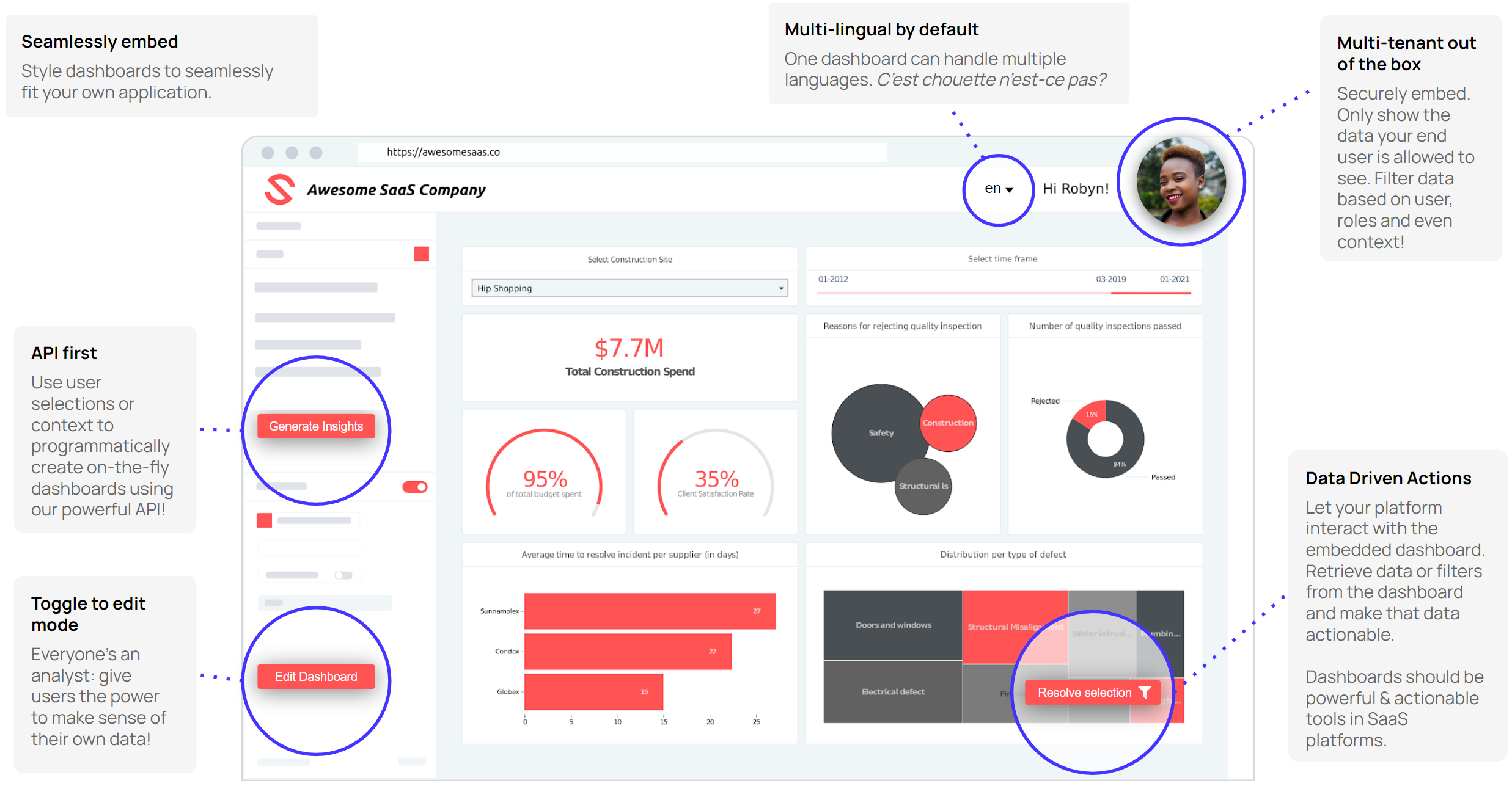Next to that, you can add custom css injection by specifying the CSS code when requesting a temporary authorization token. This enables you to change all kind of things in the dashboard depending on the user looking at it.