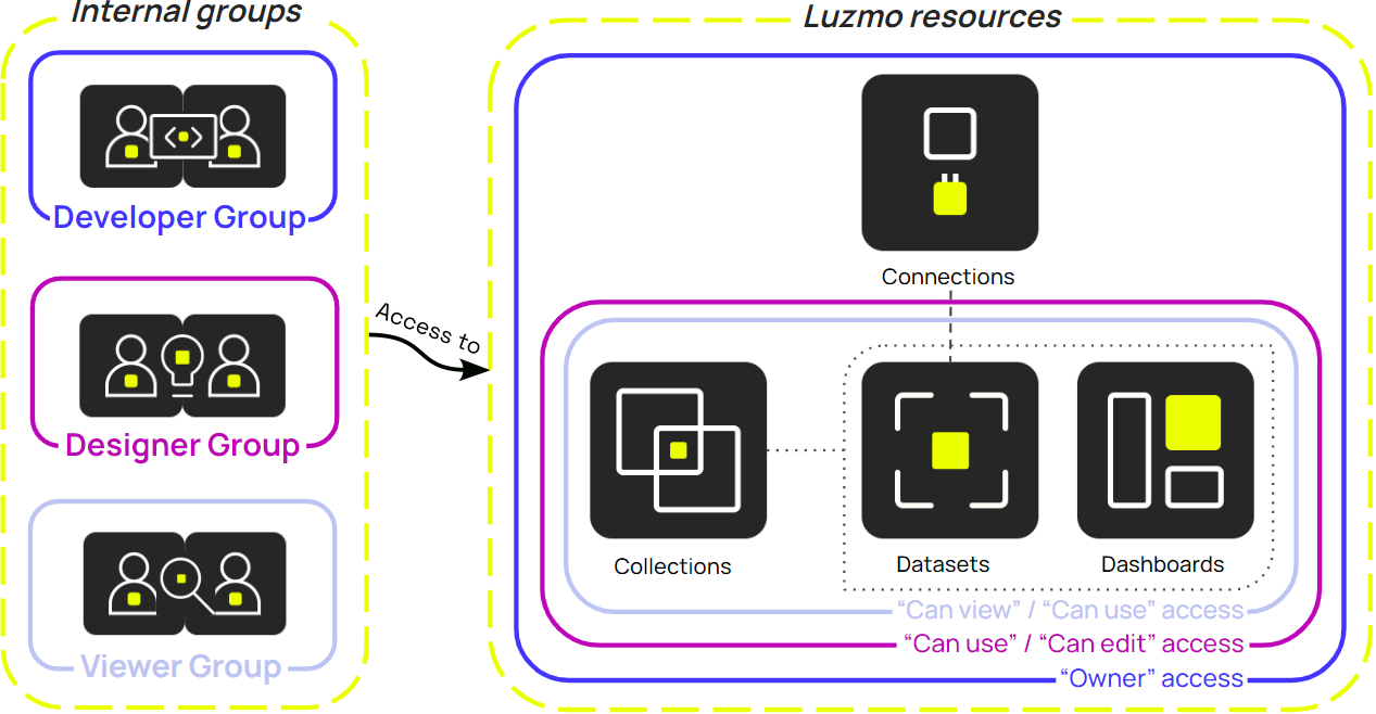 "can read" access to the collection(s), to allow providing your application's users access to these collections via an Embed token."can view" (seeing the collection), "can use" (updating access rights to resources shared with the collection), or "can edit" access (adding/removing resources shared with the collection). "can view" access to a viewer group, allowing those users to be able to see the collection!Great, now that we've set up the basis for a scalable Luzmo organization and the access management of the different resources, let's dive straight into the next article! In here, we will share some suggestions on setting up Connection(s) to your data source(s).