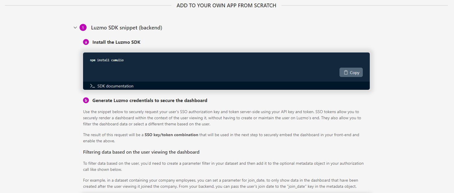 The second step is to use this SSO token in your frontend to embed the dashboard and optionally add dashboard designing possibities: this is all neatly explained in our next article.
