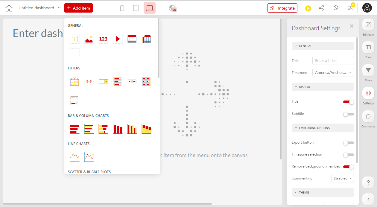 Whitelabeling means the complete rebranding of the Luzmo platform and dashboard editor. This is relevant if you want your end-users to design dashboards in a familiar environment. More specifically whitelabeling means: