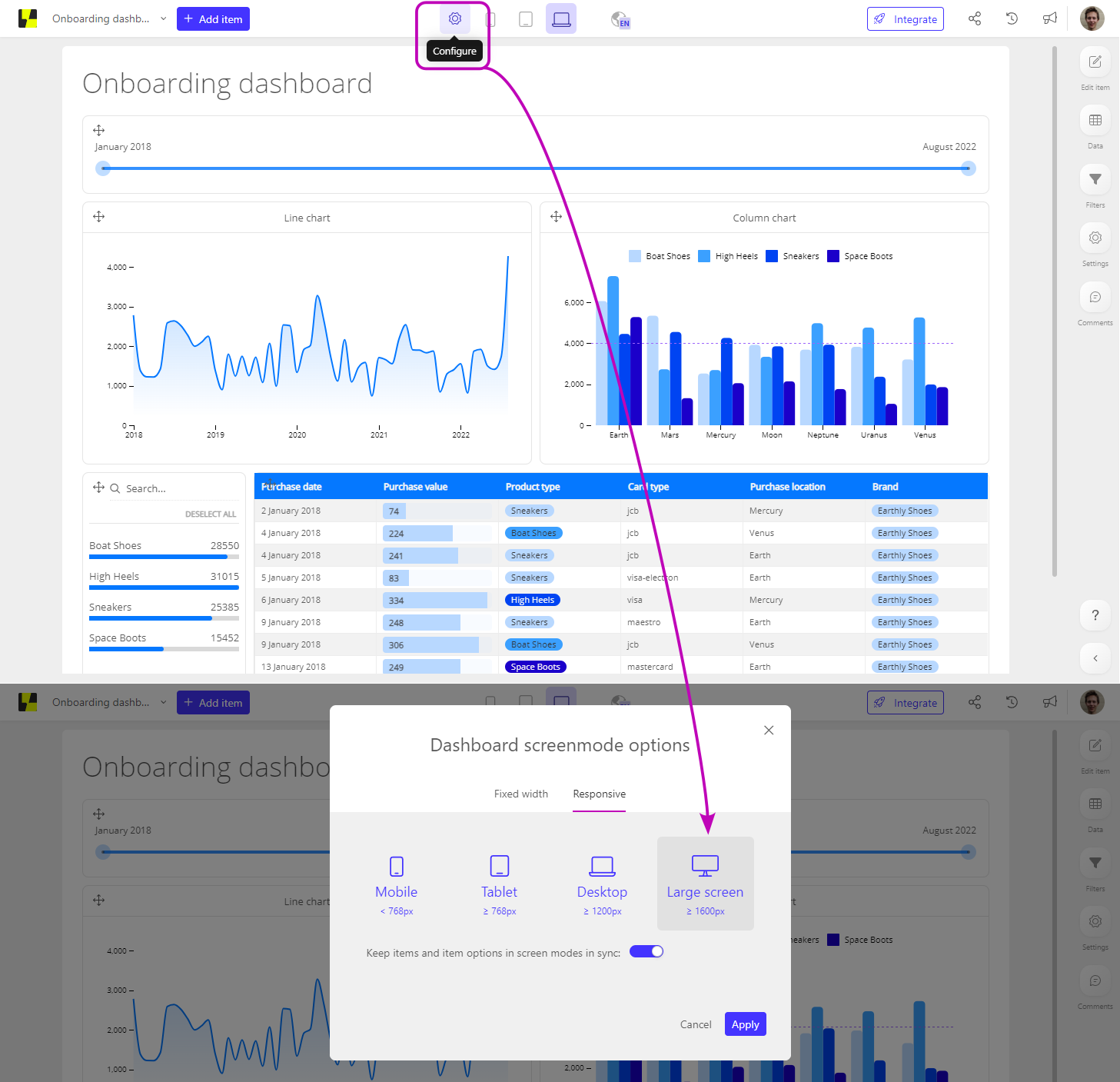 At the top of the page, you can go to the configuration settings of your dashboard - activate the “Large screen” mode. From there, optimize and rearrange your dashboard to fit optimally to this size: this is the screen size that will be visualized on your monitor(s). More information about dashboard screen modes can be found in this Academy article.
