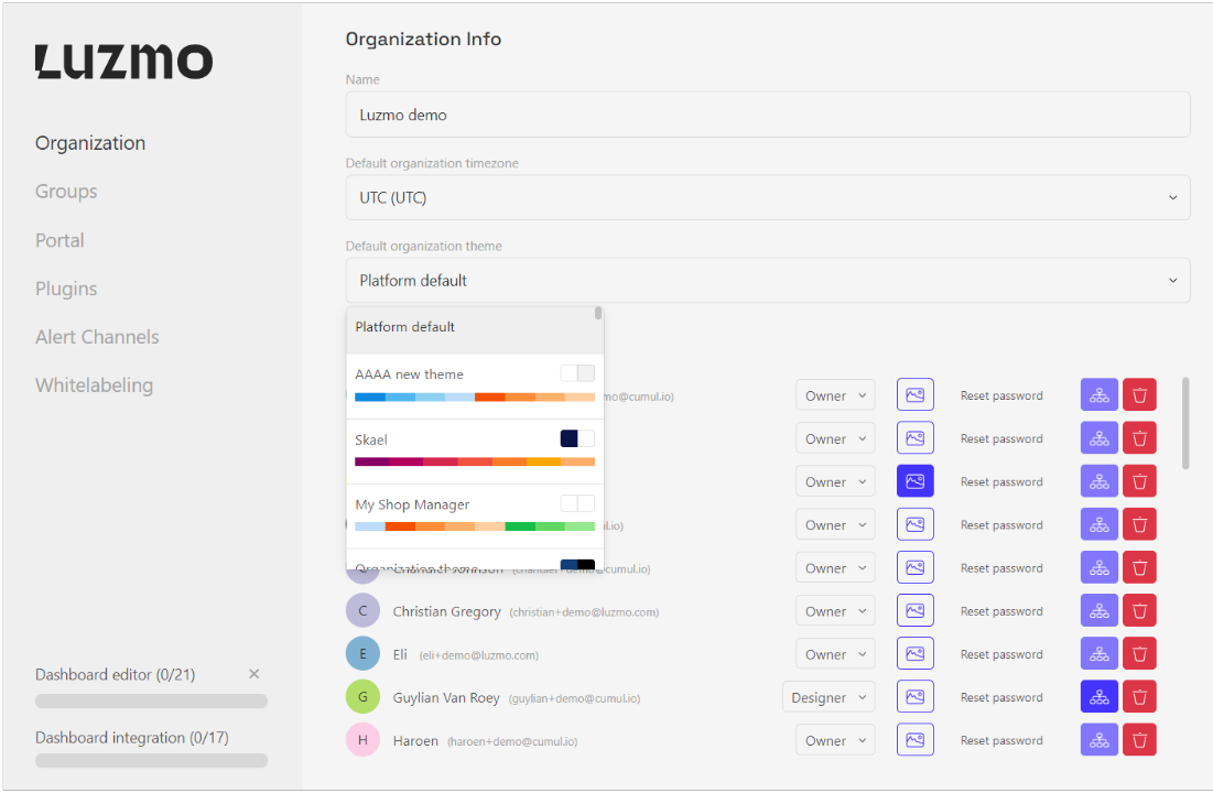 To be able to create a default organization theme, you need to have the role "owner" within Luzmo. If you do not have these rights, you can contact your colleague with "owner" rights to also grant you these. For more information about the different roles and the rights they grant you, please check out this article.