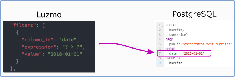 To demonstrate, you'll find an example implementation below that converts a filter's date value to a Postgres value. Since Postgres also accepts iso date strings, it requires almost no work except for proper quoting of the string. However, some databases might only accept Unix timestamps, in which case the value does need conversion.