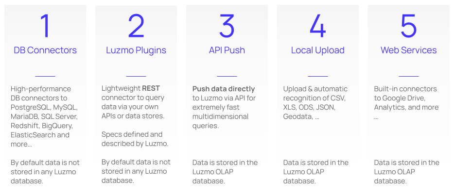 There are a few ways of connecting your data. In this article we explain the different options and highlight some of the main aspects. Please refer to the respective "Making a XXX Connection" article for your data source for more specific guidelines and information. In case you need to whitelist Luzmo's IP addresses, check out this Academy article for the necessary details.