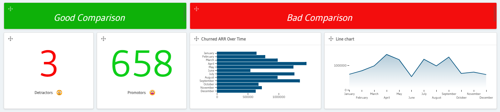 When comparing data, ensure that related datasets are visually aligned to facilitate easy comparison. Use consistent scales and formats, and avoid overly complex or misleading visualizations. Clear labeling and intuitive arrangement of data points will help users quickly discern differences and trends. If you are displaying comparison in two charts then try to place them beside each other and use the same chart type, like in the first example below.