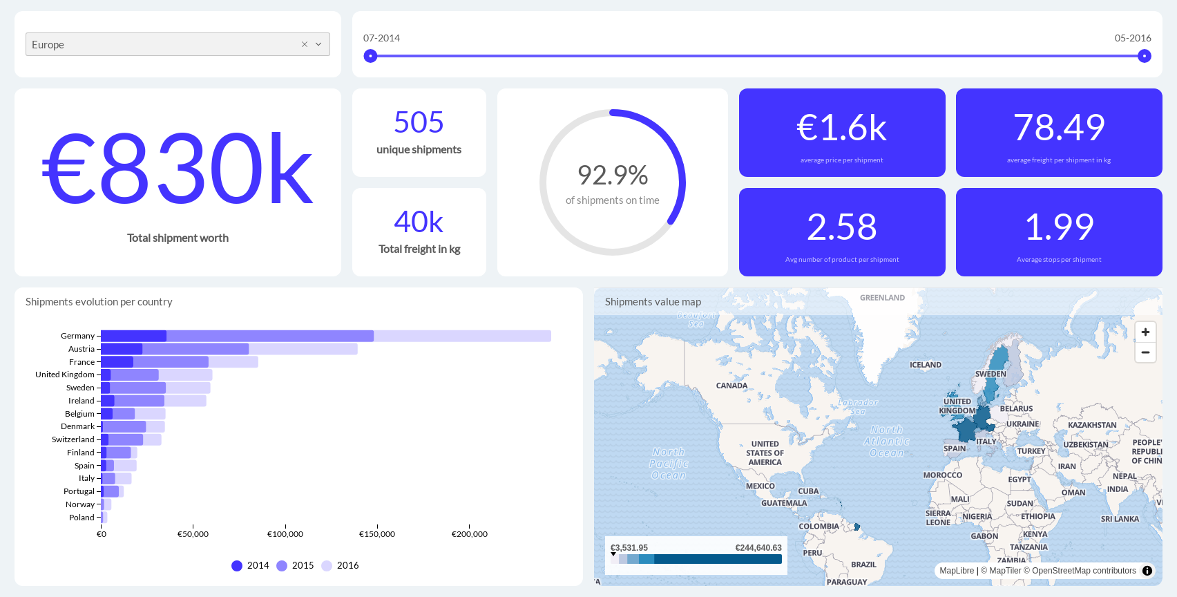 - Detailed Information: If detailed, row-by-row information is necessary, place it in a table at the bottom of the dashboard. This approach allows users to first interact with high-level visual data and then refer to the table for more granular details if needed.