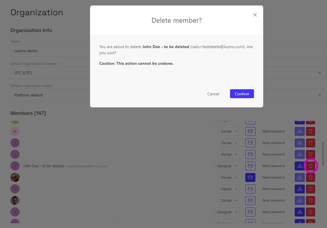 As an administrator, you will run into situations where you will have to delete certain users. The process is simple and starts in the "Organization" tab of your account settings.