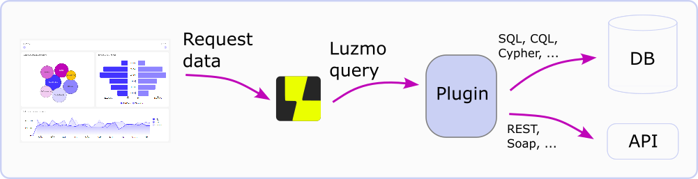 Plugins are an answer to all these desires. Plugins are in essence a small API that sits in between Luzmo and your API, database or web service. They receive a Luzmo query and are responsible for retrieving the data for that query from an underlying database, API or webservice.